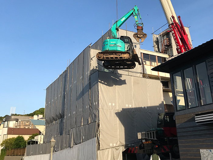 コンクリートを流し込み柱として作られたRC(鉄筋コンクリート)造の建物の解体工事。